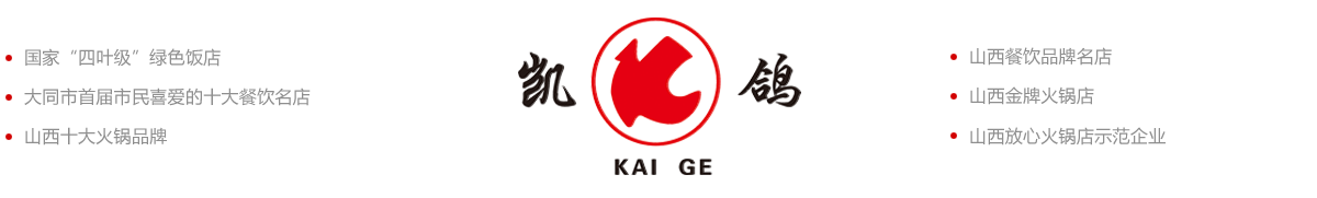 公司自成立以來,已先后榮獲******、省、市各級人民政府和有關部門頒發的“工人先鋒號”、“四葉級綠色餐飲企業”“全省就業再就業工作先進單位”“山西烹飪餐飲飯店30年功勛企業”、“山西餐飲品牌名店”、“山西******火鍋店”“山西十大火鍋品牌”“山西放心火鍋店示范企業”“大同旅游特色美食體驗店”等榮譽。2023年“凱鴿火鍋宴”“西京全羊宴”,被******中餐業聯合會授予“國際中餐名宴”稱號。2020年和2022年累計為抗擊疫情捐贈餐費約136.8萬元。
